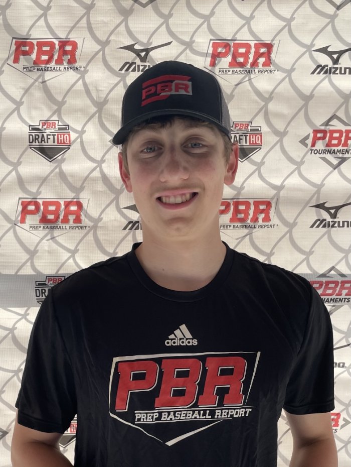 Offensively: RHH. Wide feet and bent knees, keeps the hands up very high above the ears; uses a toe tap into a small stride forward, pushes the hands back slightly just before swinging. Active lower half, repeatable and on time in his mechanics with Slightly uphill path, bottom hand dominant swing with a knob to the ball type swing. Shot the ball well the other way, also sprayed some line drives to the pull side; peak Trackman exit velocity of 91 MPH.