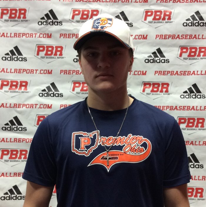 Justin George: 3B/RHP, (2021) Cloverleaf, OH. 5-foot-9, 180-pound solid frame. During batting practice, the right-handed hitter had an exit velocity of 87 mph. Begins in an athletic stance with a smooth quick load, then uses a leg kick. Bat speed is average and uses a rotational swing plane. Athletic while in the infield, made throws at velocities up to 75 mph; shows a clean exchange, soft hands, and athletic consistent feet. Fielded the ball one hand with athletic movement laterally. On the mound, showed a ¾ arm angle and a compact arm action with quick arm speed. Drop-and-drive type pitcher and shows easy effort. Athletic balance point. Produced a fastball that came in at 74-76 mph; has running action and arm side control. His 11/5 curveball (63-66) shows gradual action. His changeup (69-70) shows fading action and arm side control. Shows gradual action on his 11/5 slider (63-64). Ran a 4.31 30 yard dash.