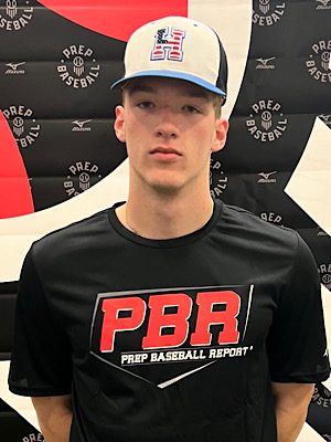 Hit: LHH. Neutral stance with an upright posture. Hands get set at shoulder height with a high back elbow and 45 degree bat angle. Slight arm bar posture with lead arm. Short weight stack on to the back leg and utilizes a short and traditional stride to the front toe. Lower half works rotationally through the zone into a slightly bent front leg. Strong top hand finish with hands working rotationally through the zone. Level bat path and works the hands hard to the inside part of the ball. Drives the ball well to the opposite field. Developing bat speed and hand strength.