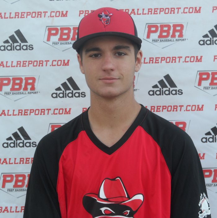 5-foot-11, 170-pound, average athletic frame, shoulders are sloped, has room to fill out. A right-handed hitting catcher, at the plate the stance is even, feet are shoulder width apart, hands are loose at the letters, bat starts in a flat position on shoulder. The lower half is under control, easy controlled stride, with backside drive. The swing is free and easy across his chest, path is level, keeps hands inside the baseball and finishes the swing with one hand. The barrel has some life out front, the tee exit velocity was clocked at 74 mph, with a ton more in there. Defensively, recorded a pop time of 2.0-2.12, throws were on the bag, arm has strength to it for his age, at 73 mph. The setup is wide and balanced when receiving, hands are soft, gets around all pitches and works hard on the low pitch. The foot work is more right foot replacing left foot, and gains ground. The lead leg could be a bit softer on landing, will help get out front more. Good looking young catcher, has arm strength.