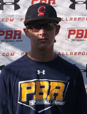 5-foot-9, 155-pound, LHH hits from the same wide and even stance we saw from him at the Underclass Games, stride is longer than in the past but remains short, hands go back in a smooth manner to get loaded, lower half stays pretty balanced, swing plane is general flat through the zone but can be a little steep on occasion, line drive hitter can spray the ball around. Defensively, showed good hands and pretty good footwork behind the plate with a high exchange and a short arm action through a high ¾ slot, athletic enough to play anywhere on the field.