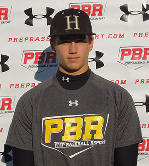 6.24.15 Hit from a balanced and athletic stance that was slightly open. Fluid rhythm with a smooth load back. Abbreviated leg kick stride that stayed on line. Lower half exploded to the baseball. Good balance throughout swing. Explosive bat speed with a bat exit velocity of 89 mph. Good approach to the round. Short, level swing path with good extension. Gap-to-gap hitter with pull power. Swing has the components of an elite hitter. In the outfield, he threw from a high ¾ arm slot that was short. Throws were accurate. Positional velocity of 87 mph. Soft hands with clean footwork that played through the ball. Exchanges were quick and clean.